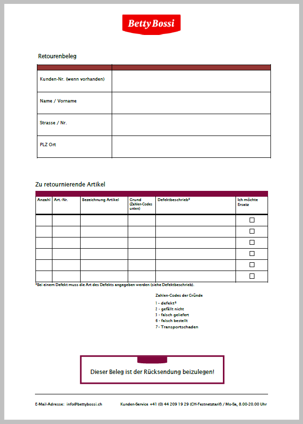 Retourenformular ausfüllen und dem Paket unbedingt beilegen.